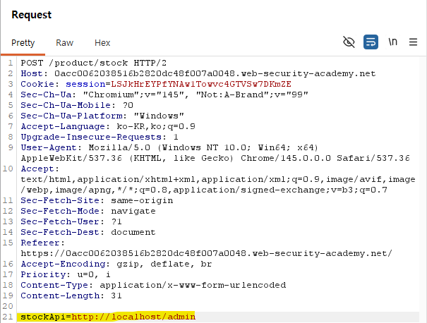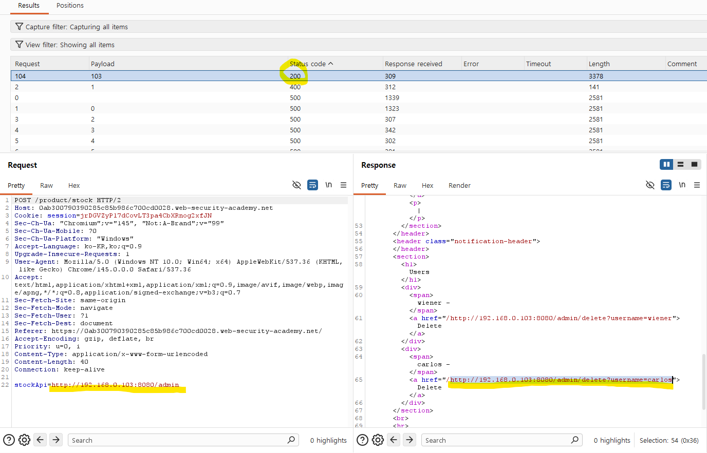 이것도 마찬가지로 stockApi에 URL정보 입력하고 burp suite의 intruder 기능으로 payload값 자동으로 바꿔서 공격가능.
